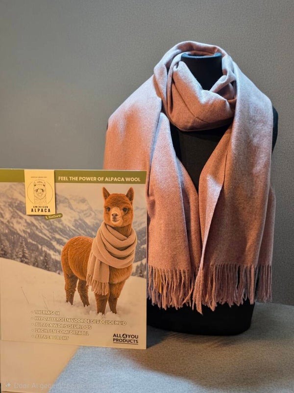 Ervaar ultieme warmte en luxe met deze prachtige American alpaca wollen sjaal in een prachtige gemeleerde "oud"roze kleur met paarse en lila tint. Met een royale lengte van ca 2 meter en een comfortabele breedte van ca 65 cm is deze sjaal perfect om jezelf stijlvol in te wikkelen tijdens koude dagen. De zachte, ademende alpaca wol biedt uitzonderlijke isolatie en een zijdezacht gevoel op de huid — ideaal voor wie houdt van kwaliteit en elegantie. Een tijdloze accessoire die elke winteroutfit compleet maakt.